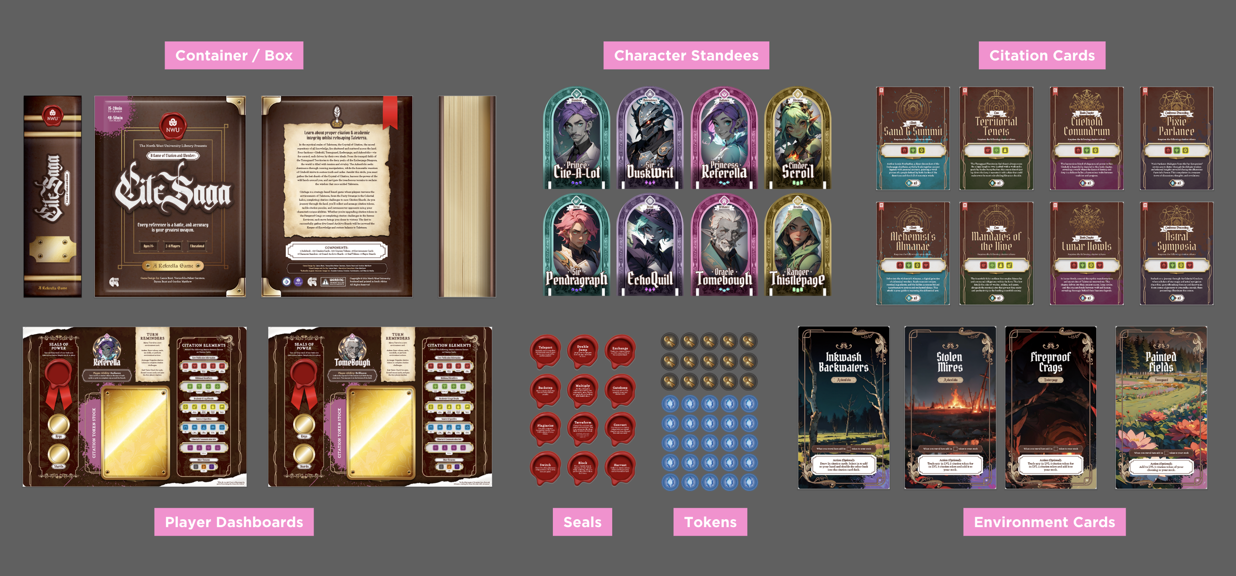 In CiteSaga, players embark on an adventure to gather the fragmented shards of the Grand Archive in the realm of Taleterra. Players take on character roles with unique abilities, journeying across environment cards that represent diverse terrains, each offering distinct citation challenges. To progress, players must collect citation tokens of varying levels, arrange them strategically to solve citation card puzzles, and complete challenges that reinforce academic referencing skills. The first to gather five Grand Archive Shards wins, restoring the Grand Archive and earning the title of Archive Keeper.